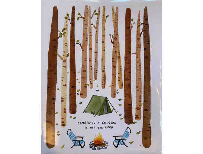This is a unique print of campfire in the woods from Neon Raspberry Art House in Occidental.