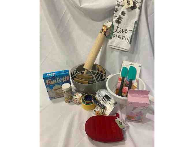 Bowl set, measuring cups, oven mitt, cake mix, sprinkles, cupcake liners, icing bag kit