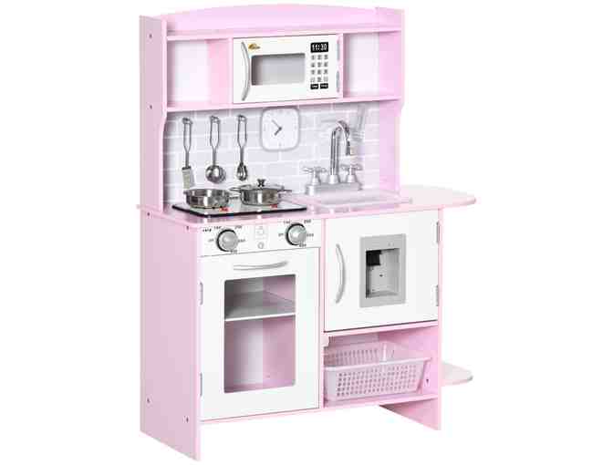 - REALISTIC: This kitchen for kids offers the feeling of an accurate and lifelike working kitchen, with a sink, faucet controls, and a pretend clock for timing meals. A microwave is also included.