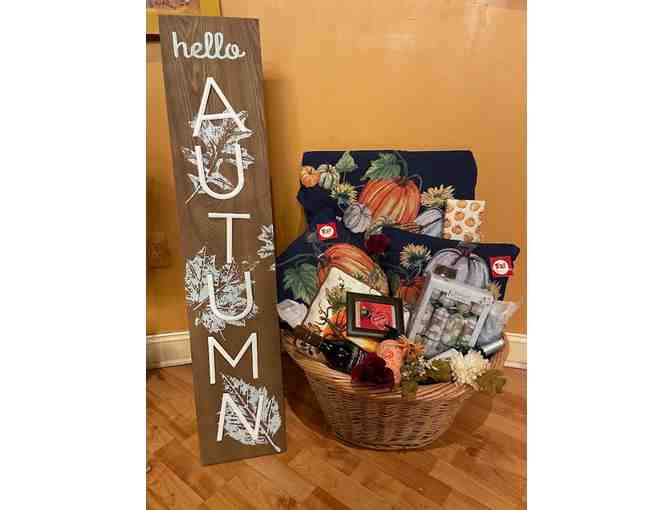 Autumn porch sign, 2 fall pillows, table runner, platter, handsoap, hand towels, Fall scarf, gift box chocolate liquor, stemless blue glass, Wegman's Gift Card ($25), botltle of wine
