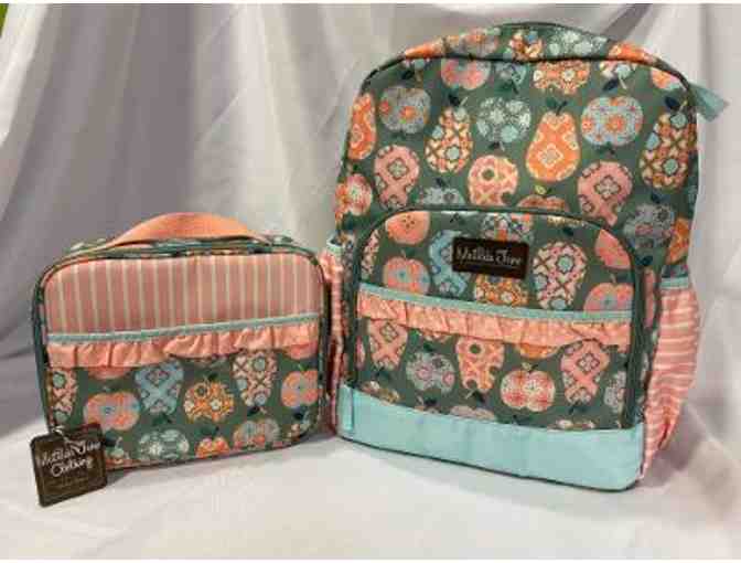 Large apple print backpack and matching lunchbox by Matilda Jane. Lunchbox is insulated with pockets.