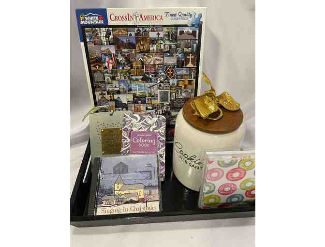 Cookies for Santa cookie jar, Medema CD, cross puzzle, ornament, coloring book, notecards, tray