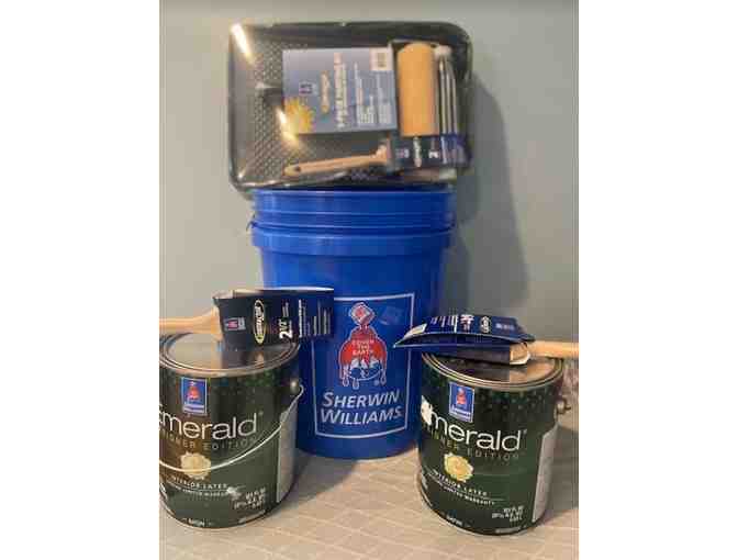 This package includes Two Gallons of Emerald Designer Addition Paint, a 5 piece Painting Kit from Sherwin Williams, 2 additional brushes and a wonderful storage bucket on Mineral Spring Avenue in North Providence.