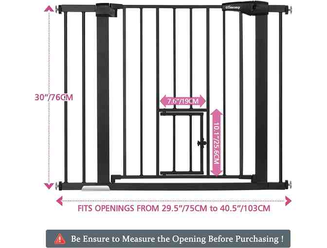 Large and Wide - Fits 29.5-40.5 in openings. Must measure your openings before purchasing this extra wide baby gate. The small pet door allows cats and small dogs to walk through.