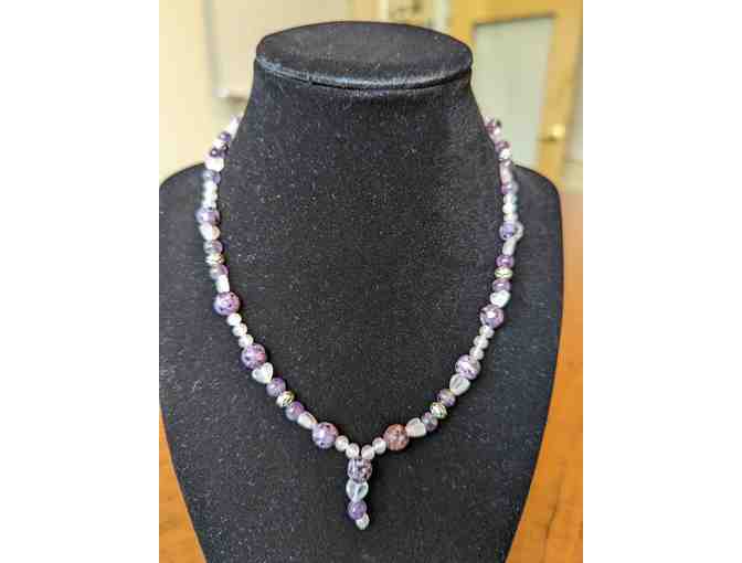 Semiprecious gemstone necklace: small rose quartz hearts, amethyst, purple jasper, sterling silver clasp