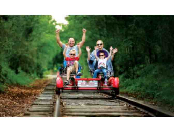 A rail explorer is a pedal-powered vehicle that rides on railroad tracks. They have 4 steel wheels, hydraulic disc brakes, and pedals for each seat, and are comfortable, fun, and easy to ride. Although the rail explorers require pedaling, the magic of steel wheels on steel rails makes the experience very different from riding a regular bicycle. There is no need to carefully watch the road ahead, there is no need to steer and riding is hands-free - making it easy to take photographs and video as you roll along. You will enjoy a Tandem Rail Explorer (2 seats) with this package at a $98 value.