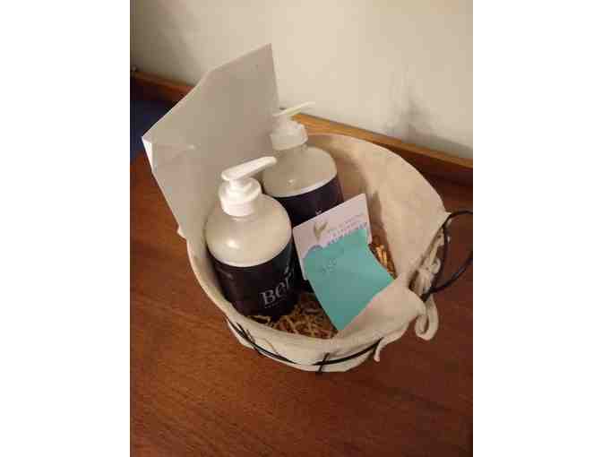 The basket contains two bottles of Berry Enzyme Detergent with Orecard Scent produced by Mulberrys Cleaners along with a $50 gift card to Mulberrys Dry Cleaning and Laundry Services.