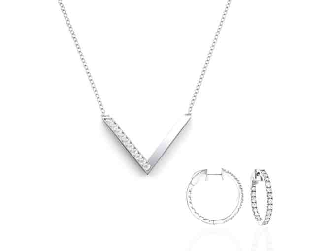 Add glamor to your day with these exquisite jewels! Designed in California and finely crafted in Europe, in solid 925 sterling silver and heavy gold overlay and world-renowned zirconia - the best simulated diamonds ever created! The necklace measures 18 inches, with adjustable length. Lobster clasp. A signature butterfly detail in the back complements this lovely piece. A beautiful array or clear zirconia adorn the hoop earrings inside and outside. Outstanding packaging for gifting or to hold your keepsakes! Created exclusively for the philanthropic community.