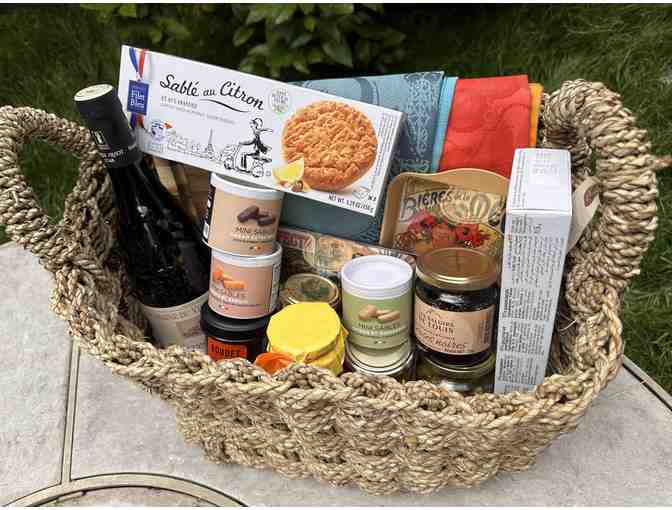 French Basket includes: -2 Garnier-Thiebaut tea towels -Chateanneuf-du-Pape wine bottle -Acacia Cutting Board Set -Sablé au Citron -Galet de Quimper -Bières de la Meuse, metal tray -Bières de la Meuse, coasters -Edmond Fallot, Cornichons extra-fins -Edmont Fallot, burgundy mustard -3 mini sablés (cacao, tomato, citron) -Les saloirs de Louis, cerises noires -L'ami Provençal, traditional candies -L'abeille diligente, miel d'oranger -Boudet, confiture four red fruits -4 Laguiole knives (cheese and butter) -Seagrass basket