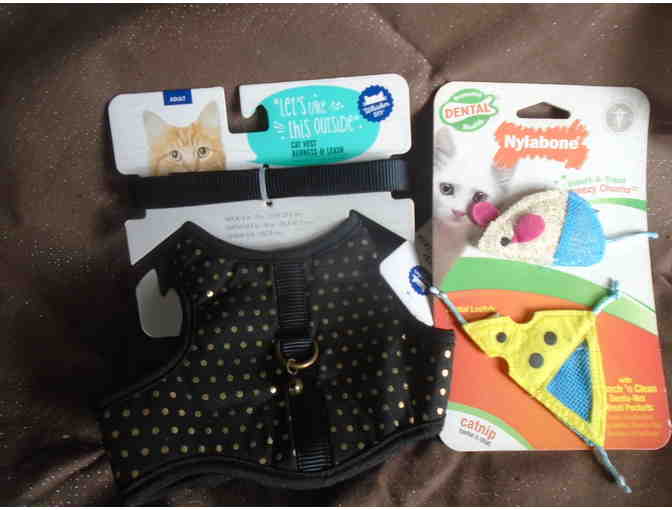 This cat vest/harness will fit a cat with a 9in  neck size.  It locks securely with velcro and a buckle tab - no escapes there.  It incluses a matching leash too.  There are some Nylabone 'munch N clean' denta net treat pockets as well.  These little chewy things can be used to distract your cat while you put the harness on.  Cats have to get used to things being strapped on their bodies...please be patient.