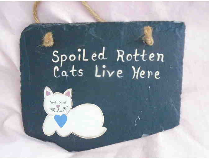 This sign painted on slate, will let all who enter know that you love your cats and spoil them as if they were family....