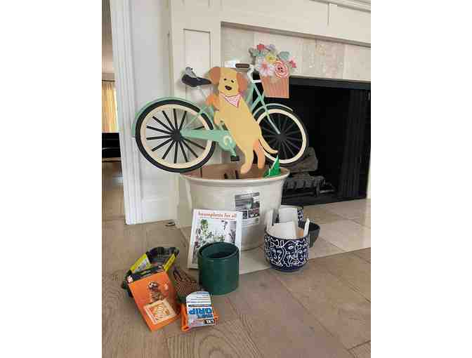 1 Large ceramic plant pot, 4 small ceramic plant pots, shears, spade, garden gloves, miracle grow, seed pods, houseplant table book, 6 seed packets, gift card to The Home Depot