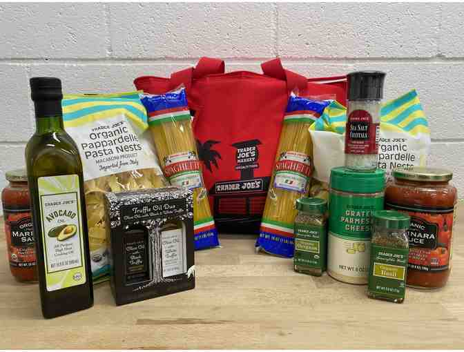 All the ingredients needed to enjoy a yummy pasta dinner at home, courtesy of Trader Joe's! Items include: insulated bag, organic pappardelle pasta, truffle oil, spaghetti, basil, oregeno, avocado oil, 3 marinara sauces, parmesan cheese and sea salt.