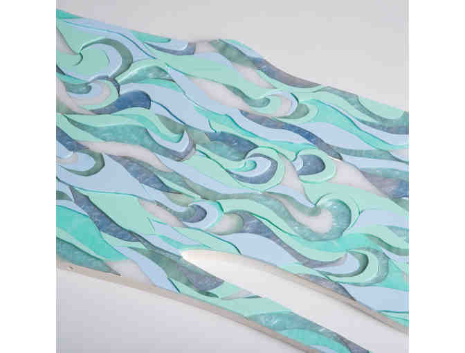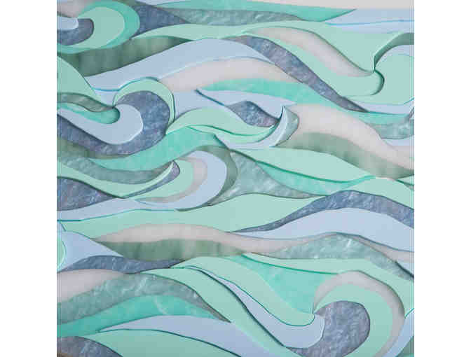 Wave Rider' consists of 9 different acrylic varieties in both color, texture, and depth. The pattern was completely hand drawn by the artist, with each shape individually separated out and cut layer by layer. Once fully reassembled the whale consists of several hundred individual pieces that mimics the movement of the ocean and is a joyful reminder of happy summer memories collecting sea glass on the beach in Marblehead.