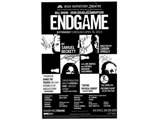 Take home this signed poster from Irish Repertory Theatre's sold-out, award-winning run of Endgame by Samuel Beckett. This poster was signed by all four cast members: John Douglas Thompson (Tony Award-nominee), Bill Irwin (Tony Award-winner), Patrice Johnson Chevannes, and Joe Grifasi. The stunning poster, designed by Irish Rep’s Art Director Muireann Lalor with photographs by Carol Rosegg and printed in limited numbers, is an impressive addition to any collection, or beautiful décor for any theatre lover’s wall!