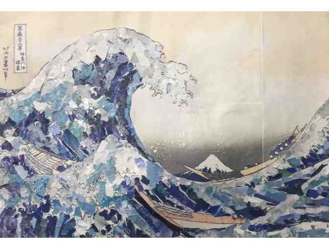 The students worked about "the big wave" realized by Hosukai. They tore small pieces of paper in different shades of blue from magazines to create a large collage of the wave. Then, they glued them to respect the colors of the big wave.