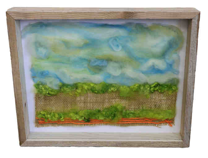 Anthony learned a new form of artistic expression using different textiles, such as roving, fabric, and fleece, to create a beautiful countryside landscape with blue skies.