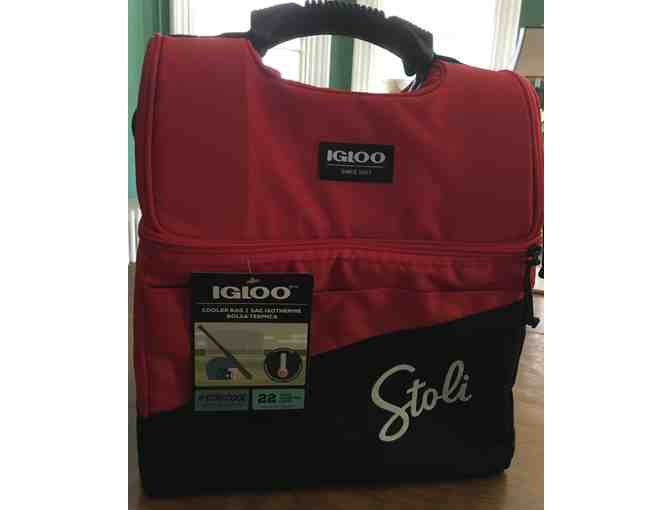 An Igloo Cooler bag Two cooler compartments for keeping items separate. Ergonomic rubberized comfort grip handle. Leak-resistant antimicrobial liner. Front slip pocket. Adjustable shoulder strap. Tent top lid for separate dry storage.