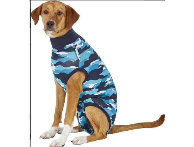 Comfortable, stress-reducing alternative to the traditional cone is recommended by vets. Snug fit with rear fastening prevents the pet from wiggling out; can be pulled back for potty breaks. Covered areas are kept clean and dry, which prevents bacteria and dirt from causing an infection. Made from a non-toxic, breathable, 4-way stretch fabric that is machine washable for reuse.