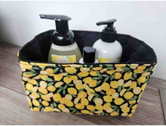 This lemon sorbet sink side set includes foaming soap, a full size hand and body lotion and a purse size lotion. All this comes in a handmade little lemon basket that will look adorable anywhere!