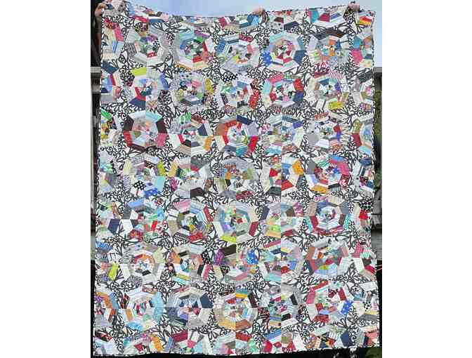 This quilt titled "Tangled Web" was pieced and quilted by Jan and measures 64" x 88". The dotted flannel backing with a strip of snowflakes elevates the cozy factor! With the similar web pattern, it complements the "Web One" quilt nicely should you have two beds in one room, or it works just as well on its own.