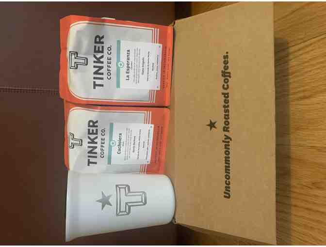 Bid on this Tinker Coffee package with (2) 12 oz bags of whole bean coffee and 12 oz travel mug.