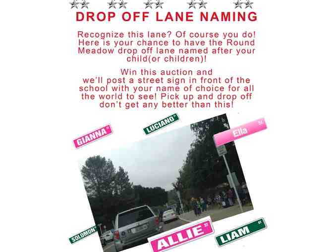 Here is your chance to personalize the New Round Meadow Front Drop off loop for the whole entire 2023-2024 school year. Dedicate it to your child or children, your family or anyone else important to you. Win this auction and we will post a street sign in front of school with your name for everyone to see! Makes a super cool gift for your outstanding student/child.