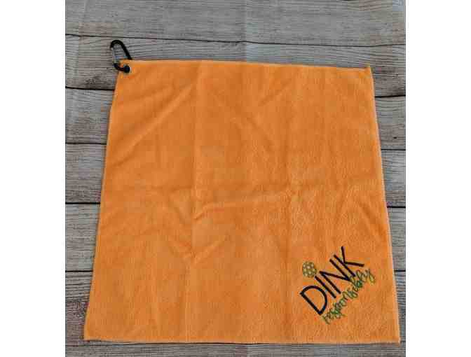 Beautiful machine embroidered design "Dink Responsibly" is stitched on a 16"x16" plush microfiber towel. Towel comes with an easy to use carabiner clip. Perfect sized towel to keep in a back pocket, clip to a belt loop, clip to a fence or clip to your sports bag.