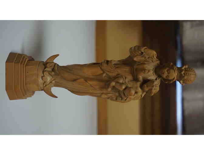 This hollow wooden statue depicting the Virgin Mary with Child on top of a crescent moon is situated on an octagonal base. Imagery of the Virgin Mary atop a crescent moon reflects the vision of St. John (Apocalypse 12:1): “a woman clothed in the sun, and the moon was under her feet.” Additionally, the statue features Christ holding an orb symbolic of his role as spiritual ruler of the world, while the grapes in his mother’s hand symbolize the wine of the Mass. This small statue would make a lovely addition to any home altar or prayer space.
