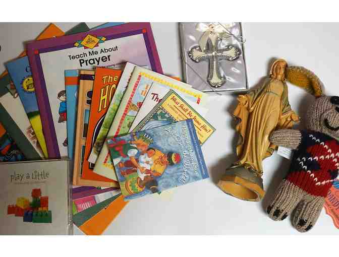 This thoughtfully-curated basket of books, music, and spiritual gifts is the perfect present for the expecting mother, family with young children, or young one celebrating their first sacraments! Included in this collection is a dozen books, a CD of action songs for little ones, a knit bunny, a decorative cross, and a Marian statue. Books range from fun instructionals on how to pray the rosary and introductory stories about specific saints like St. Therese, to The Way of the Cross for Children and a coloring book about Mary.