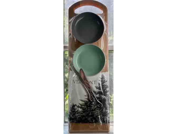 Maple Bristol Cheeseboard Set, Vermont Tea Towel, Two Dipping Dishes and Spreaders.