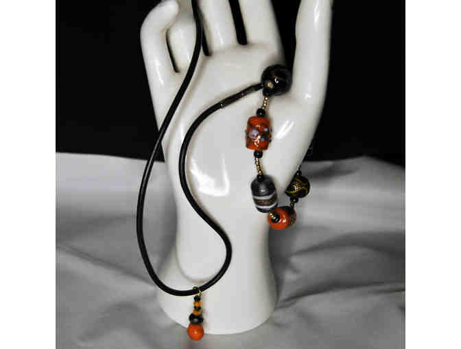 Leather Cord is 16" long and has screw closure - beaded pendant is strung on copper wire