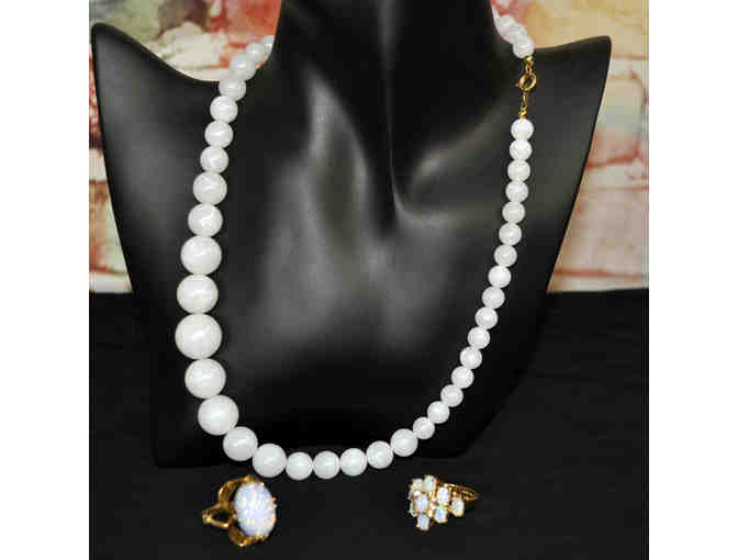 White Resin Beaded Necklace 18" and Two Simulated Opal Rings In Gold Colored Metal