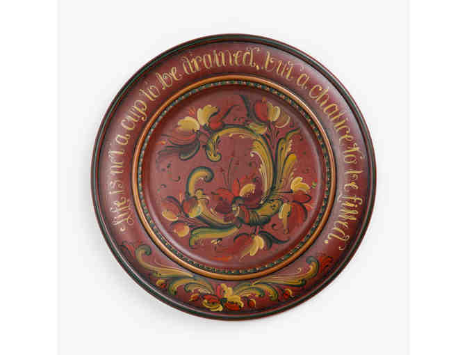 12" Dia. Woodenware by Paul Loftness. This plate was originally gifted to a business in Westby, WI to demonstrate the Norwegian heritage of the area. When the business closed, the plate was returned to the artist. Phrase around the border reads, "Life is not a cup to be drained, but a chalice to be filled." Signed and dated by artist, 2008. Hook on back for wall mounting. Artist: Jean Giese, Vesterheim Gold Medal rosemaler.