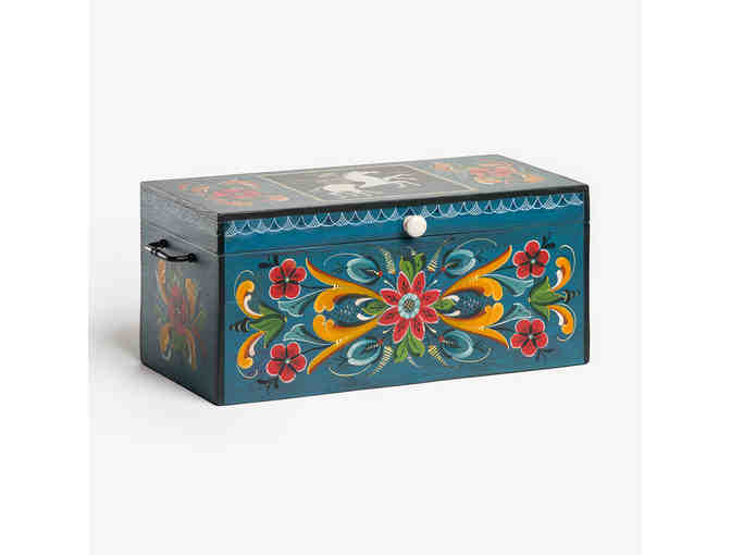 18"L, 21"L including handles, 8.25"H, 8.5"W. The artist often describes her style as Tele-Halling (a combination of Telemark and Hallingdal elements). This painted trunk includes the following information on the inside lid: "The name Sleipnir (slayp-near) is based in Norse Mythology. He is an eight-legged horse primarily ridden by the god Odin. The horse is depicited as incredibly swift with the eight legs that could carry his rider anywhere in the nine realms of the cosmos. He also appears in Icelandic folklore, as he has said to have created the canyon Asbyrgi with his massive hooves." Back of trunk is signed by artist. Artist: Barb Wolter, Vesterheim Gold Medal rosemaler.