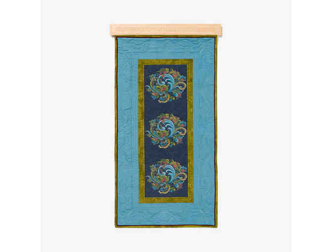 Quilt measures 32.5"L, 17.25"W. Hanger measures 18.75"W, 2"H. This wall hanging features fabric with rosemaling in beautiful aqua, moss green, navy blue, and maroon colors. The free-motion quilting was done by artist Mary Jane Lake, inspired by rosemaling classes taken with Lise Lorentzen, Patti Goke, and Ruth Green. The basswood hanger is chip-carved by Bob Lake, who has been chip carving for 30 years. Includes picture hanger on back. Embroidered on back by artist, "Created by Mary and Bob Lake, Viroqua, WI 2023." Artists: Mary Jane and Bob Lake.