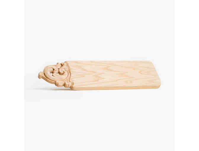 15.5"L, 21"L including handle, 6"W. Basswood Acanthus carved cheese board by Jon Hart. Design by Hans Sandom. Finished with a food-safe oil. Back is marked and dated by the artist, 2023. Artist: Jon Hart.