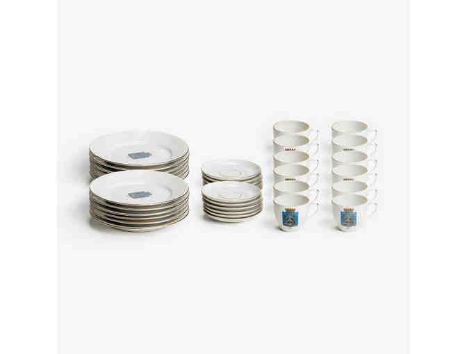 Set includes service for 12. Set is in excellent condition. No cracks. One cup has a tiny chip on the bottom rim on the underside of the cup. Places and sauces are marked PP 54 on bottom. Cups are marked PP 55 on bottom. Twelve place settings of each: 6.75" dia. plate; 4.5" dia. saucer; 2.5" dia, 2"H cup. Set has gold rim detail. Oslo crest design on cups and plates. This set was purchased by the donor at least 20 years ago from the estate of Irving Highland.