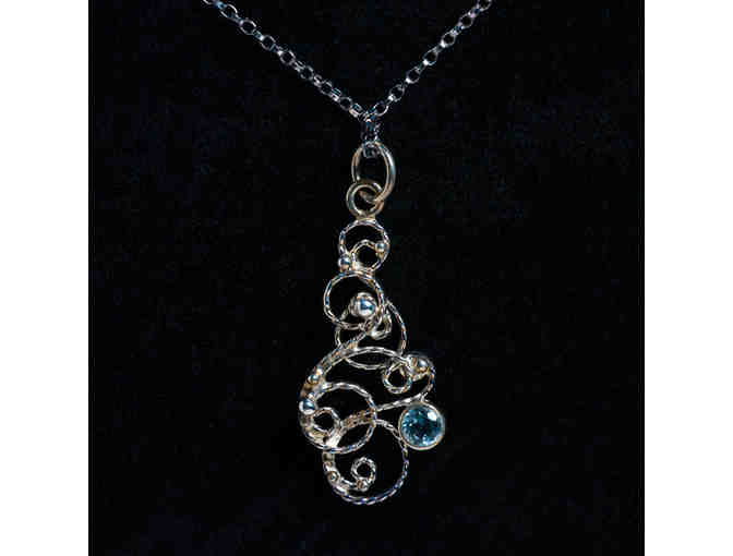 Pendant measures 1"L, .5"W, Chain measures 20". Handmade fine silver filigree pendant with blue topaz gemstone. Featured on 20" chain. Artist: Liz Bucheit, Crown Trout Jewelers.