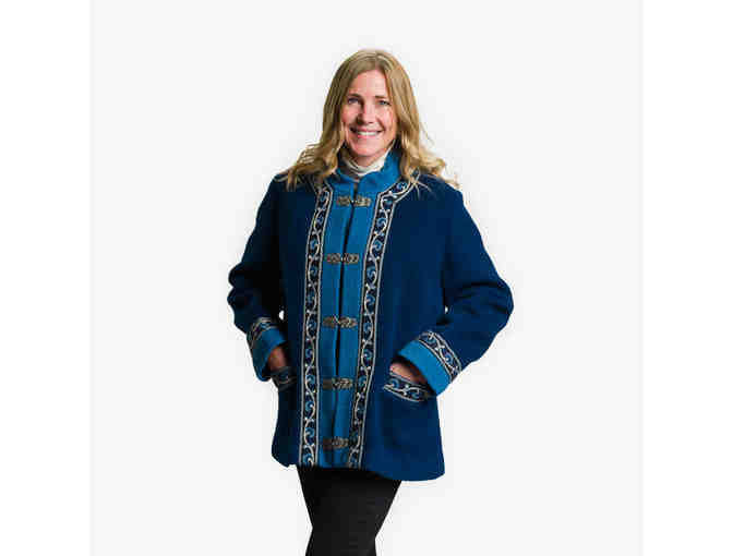 Bust measures 44", top of shoulder seam to bottom hem measures 26", sleeve from shoulder seam to wrist measures 22.5". Blue felted wool jacket with satin lining. Embroidered trim on jacket, pockets, and cuffs. Five pewter clasps on front. Jacket is gently used. Tag reads, "Fjord Fashion 46, A.S. EVEBOFOSS. Sandane Norway. Pure New Wool, Pure Laine."