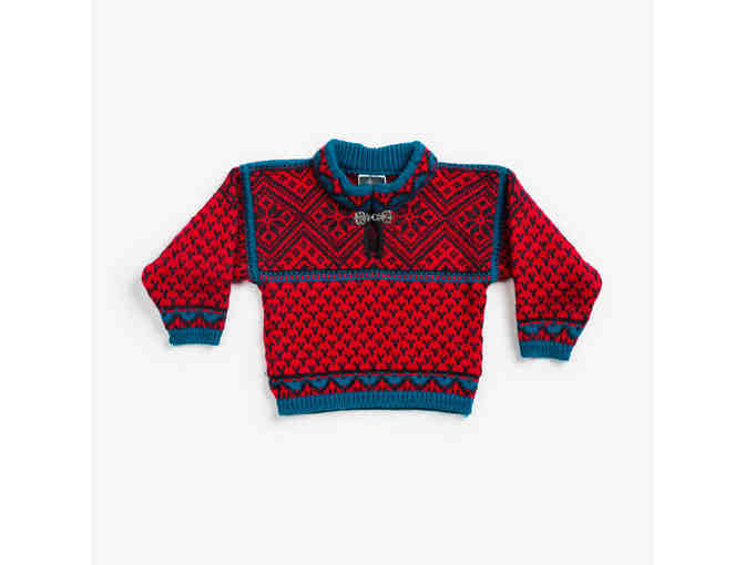 Bust measures 25", top of shoulder seam to bottom hem measures 14", left shoulder seam to right shoulder seam measures 15", sleeve from shoulder seam to wrist measures 11". Sweater is red with teal and black. One pewter clasp. Tag reads, "Dale of Norway, 2 ar (year); Pure new wool." Fits youth age 2. Sweater is gently used.