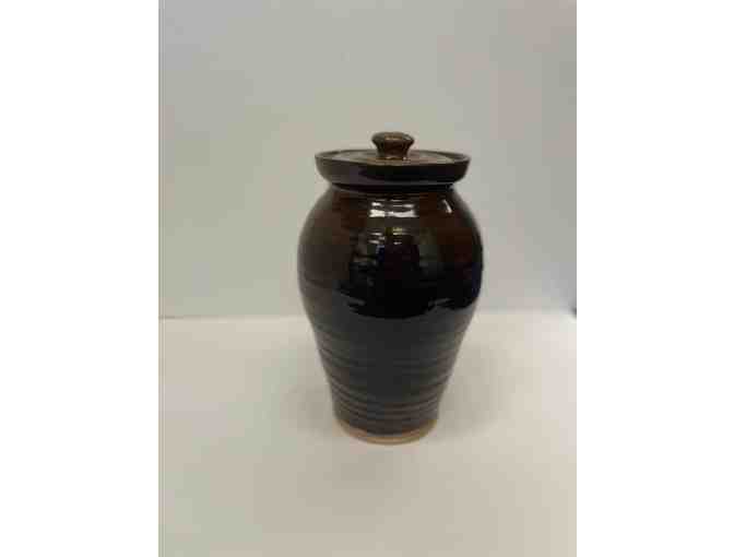 Large redware pot with lid approximately 11" tall and 7.5" wide. Take home a unique piece of Old Sturbridge Village-made redware pottery handmade by craftsman and fired in the wood fire kiln.