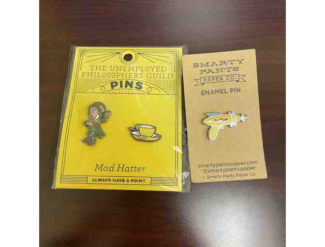 Includes 1 The Unemployed Philosophers Guild Mad Hatter Collection and 1 Smarty Pants Paper Co. Ray Gun Pin.