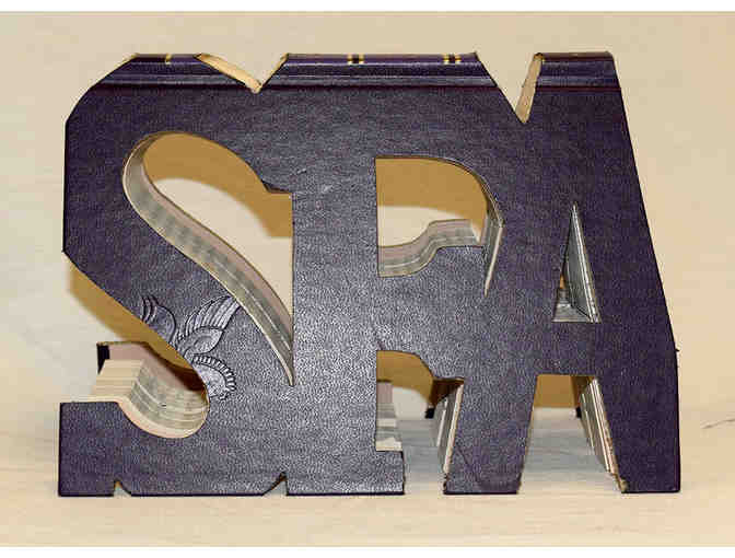 Decorate your shelves with this unique purple vintage book cut-out in the shape of 'SFA.'