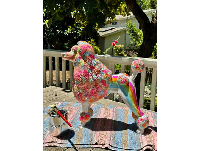 Meet "Roy G. Biv," a vibrant masterpiece named after the colors of the rainbow. This whimsical creation by artist Annie Free is a true delight for the eyes. With meticulous artistry, Annie has adorned her Poodle with the same vivacious palette of bright pastels, electrifying neons, and the enchanting hues of rainbows that define her watercolor, gouache, and acrylic creations.