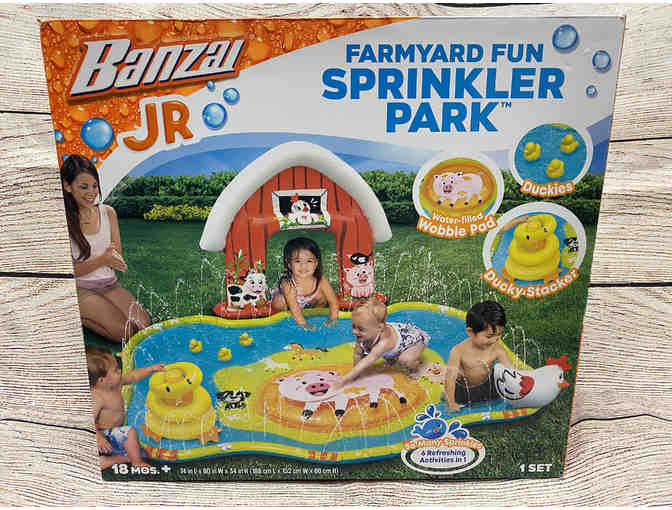 The sun is up and time to play with Farmyard Fun Sprinkler Park. A great way to play and interact with farmyard friends while staying cool with fun interactive water play. Five role-play activities build motor skills and teach the concept of action-reaction through play.