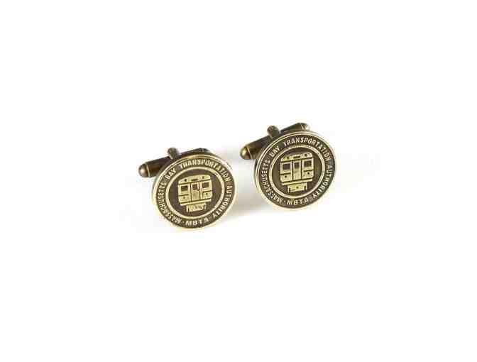 This handsome pair of cuff links features vintage MBTA (Massachusetts Bay Transportation Authority) transit tokens, with the image of a Boston rapid transit vehicle on the front. Minted in 1988, these authentic tokens are soldered onto brass bases and given an antique finish.