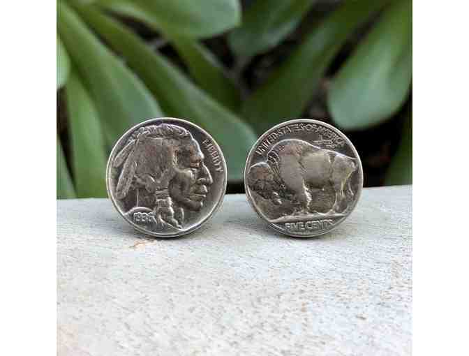The Buffalo Nickel, also known as the "Indian Head Nickel" was minted in the United States from 1913 - 1938. We use authentic coins in these cufflinks, which portray the profile of a Native American chief on one side and an American Bison on the other. The historic coins have been soldered onto pewter bases and given an antique finish.