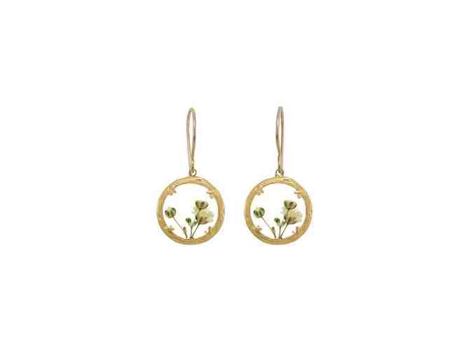 The natural beauty of an alpine meadow - delicate shapes and bright bursts of color - is captured in still life inside this two-sided glass chamber. These earrings are subtly enhanced by a frame of organically styled, softly textured branches. The tiny landscape of dried flowers brings the delight of discovery wherever they go. Handmade in Hawaii.