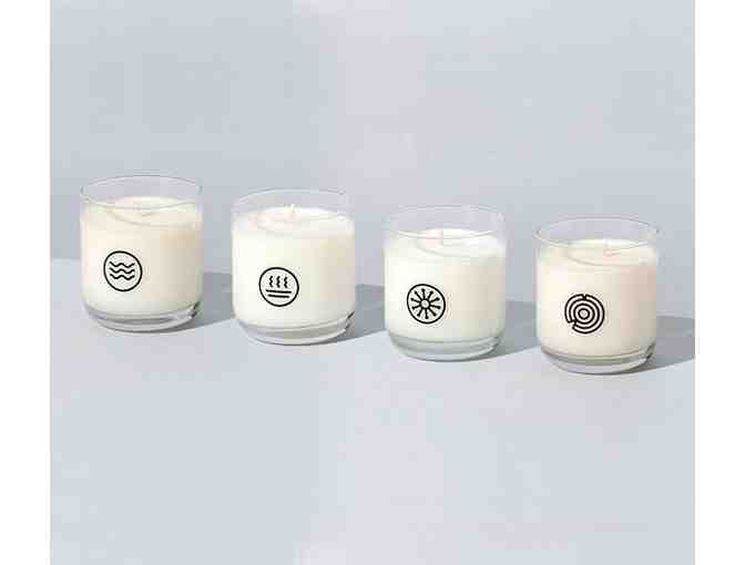 A set of four 7.4 oz. candles in each of the signature Keap fragrances: Wood Cabin, Waves, Green Market and Hot Springs. Wood Cabin, notes of cedar wood, burned pine, palo santo nutmeg and cade juniper. Hot Springs, notes of eucalyptus, lavender absolute, cedar leaves, neroli and yuzu. Waves, notes of sea salt, calone, cyclamen, star anise and galbanum. Green Market, notes of garden mint, basil, cucumber, fig leaves and water hyacinth.